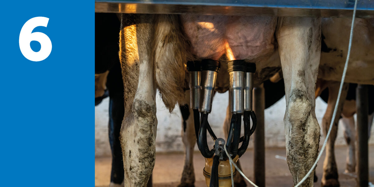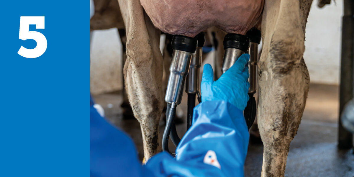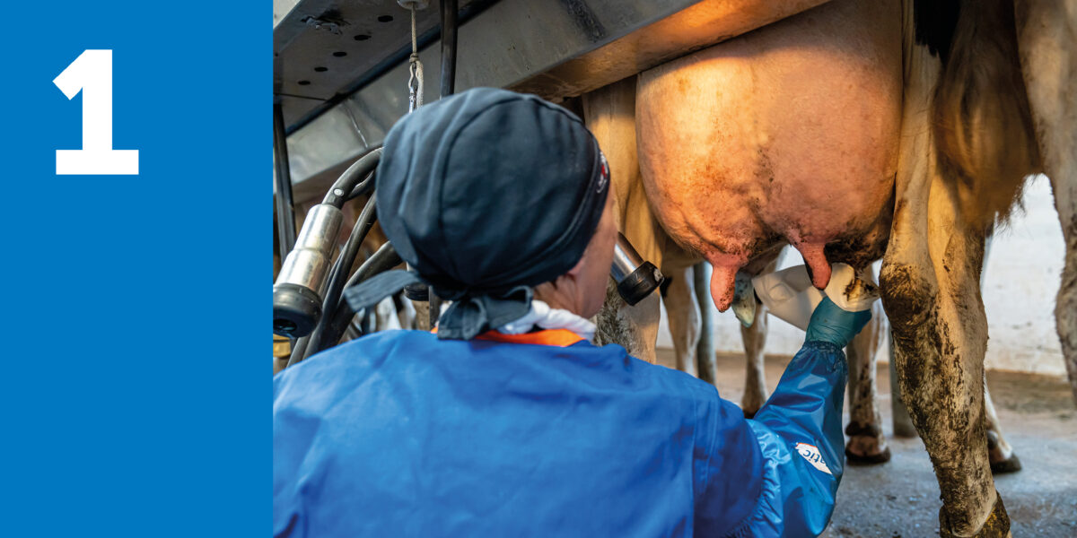 Einige Strahlen vormelken: Dies gewährleistet eine optimale Stimulation und gleichzeitig kann auf Flocken in der Milch kontrolliert werden.