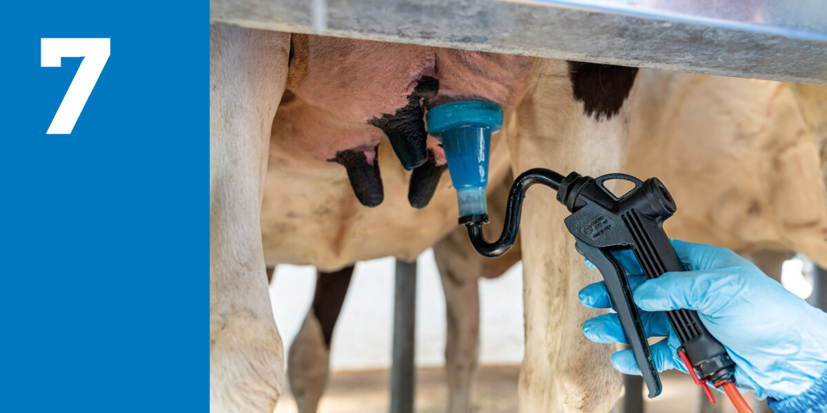 WICHTIG: 10 bis 12 Sekunden Zitzenkontakt pro Kuh (einige Strahlen vormelken, reinigen und trocknen)