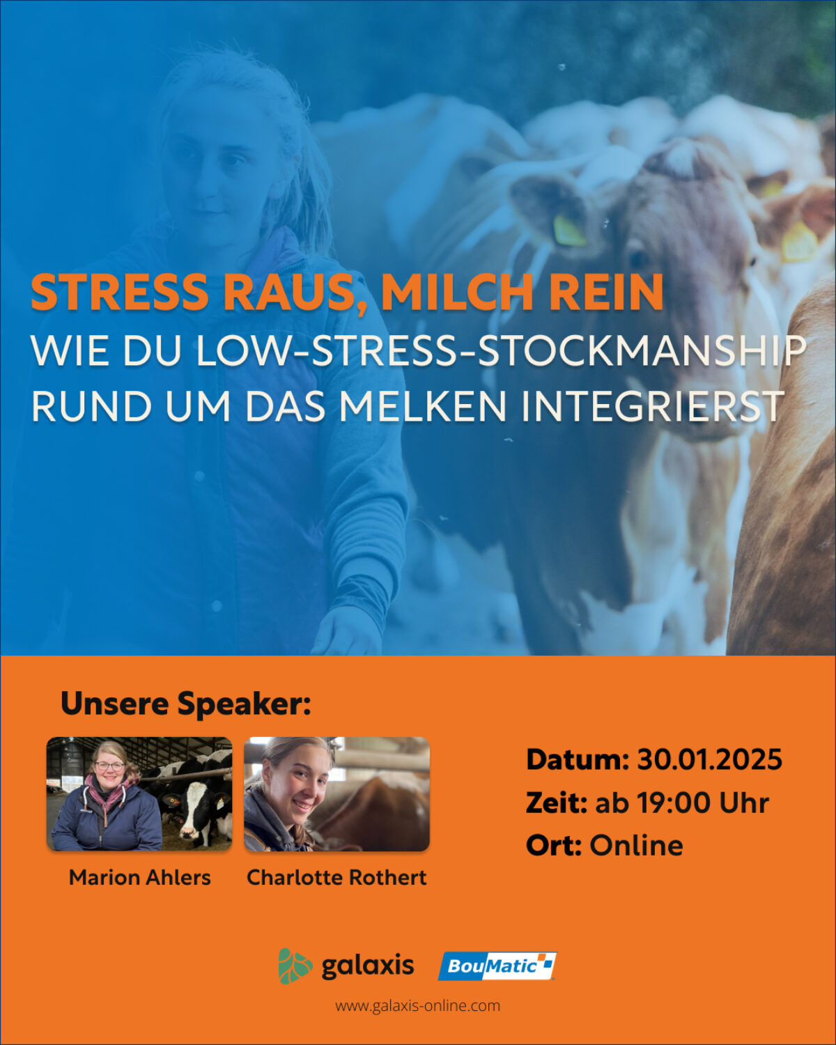 Melde dich über den untenstehenden Link zum Webinar an und erfahre, wie du für entspannte Kühe und optimale Milchflüsse sorgst.