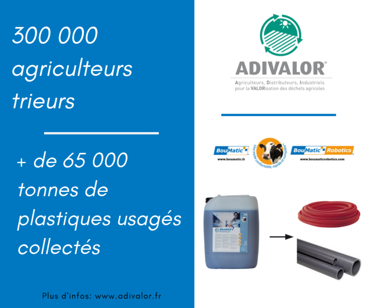 Aujourd'hui, ce sont quelques 300 000 agriculteurs en France qui recyclent leurs déchets plastiques via la filière ADIVALOR. Cela représente pas moins de 65 000 tonnes de plastiques usagés collectés. Chez BouMatic, nous sommes fiers de nos éleveurs qui agissent pour l'environnement en participant à la valorisation de leur déchet via ce programme.