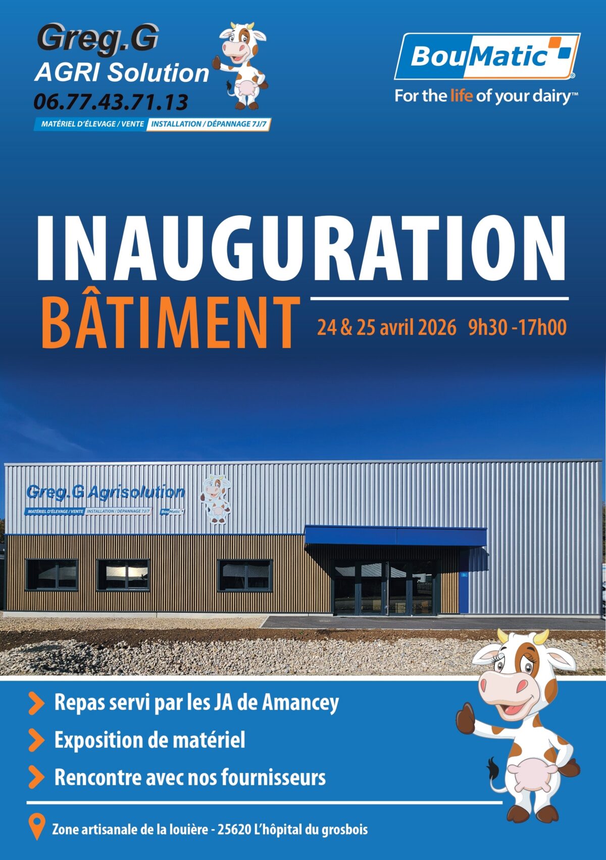 BouMatic est heureux de vous annoncer l'inauguration du nouveau batiment de son concessionnaire Greg. G Agrisolutions. Venez nombreux découvrir les innovations BouMatic et passer un agréable moment en notre compagnie.