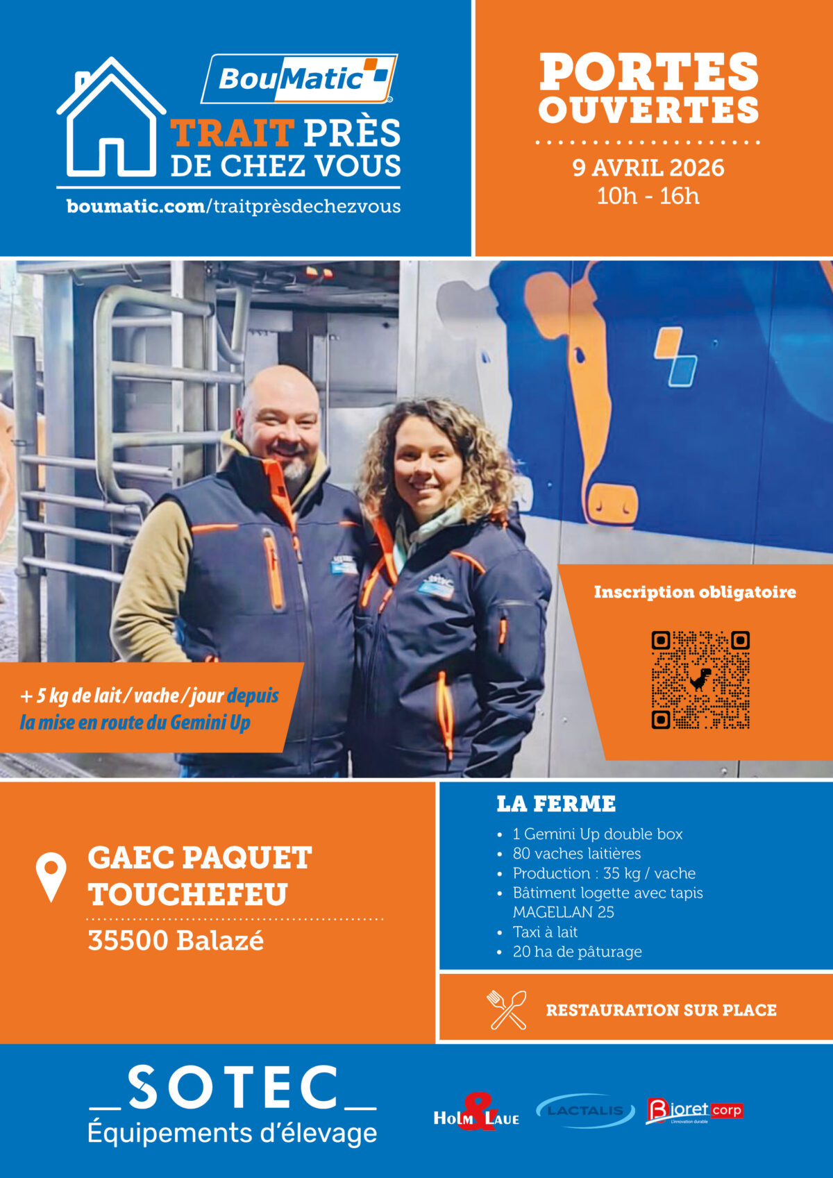 BouMatic et SOTEC sont heureux de vous inviter à la porte ouverte du GAEC Paquet Touchefeu. Vous pourrez voir les très bons résultats obtenus par cet élevage comptant 80 vaches laitières sur 20ha de pâturage. +5Kg par vache et par jour depuis l'installation du Gemini Up!!!