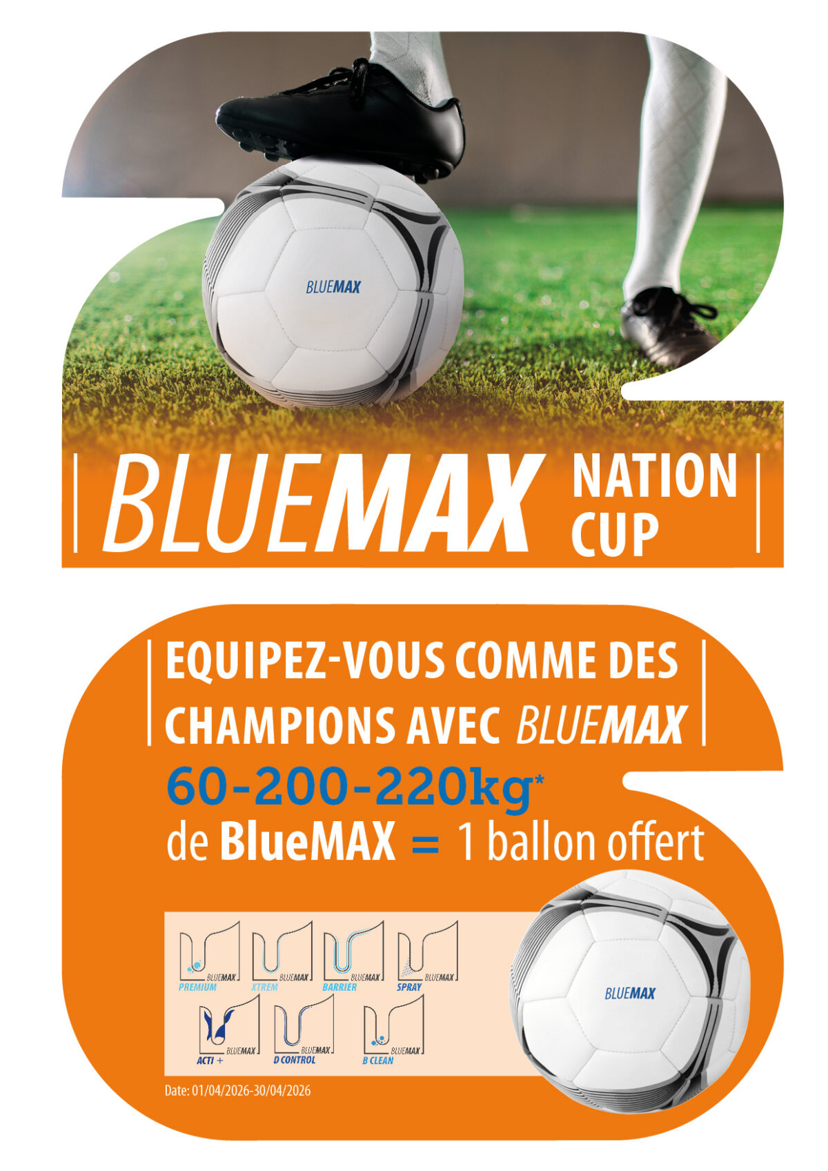 *Offre exclusivement disponible auprès des concessionnaires agréés en France, Suisse Romande et Wallonie (Belgique) pour toutes commandes du 01/04/20206 au 30/04/2026 et livrées au plus tard pour le 15/05/2026. A l’achat de 60kg (3*20kg ou 60kg) ou de 200-220kg dans l’ensemble des produits de la gamme BlueMAX, un ballon est offert. Offre non cumulable avec d’autres actions spéciales ou promotionnelles. Offre valable dans la limite des stocks disponibles, BouMatic se réserve le droit de vous proposer un autre article promotionnel. Les articles offerts ne seront ni repris, ni échangés. Pour toutes questions, contactez votre ASM BouMatic.